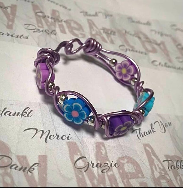 This bracelet is handcrafted from braided aluminum and fitted with polymer flower beads. The bracelet is available in all sizes, from baby size to larger sizes. The unique design and natural materials make this bracelet a perfect accessory for both everyday and special occasions. It makes a great gift for friends and family or for yourself as a unique and special showpiece.