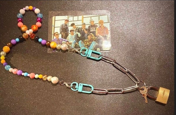This handmade Ateez bead necklace comes with a lock and Lomo card. The colors of the necklace are inspired by the band's theme. It's a stylish piece of jewelry that will surely catch the eye of any Kpop fan. The combination of beads and lock adds a unique touch to the necklace, making it a one-of-a-kind accessory. Wear it with your favorite outfit to show your love for Ateez and Kpop fashion.