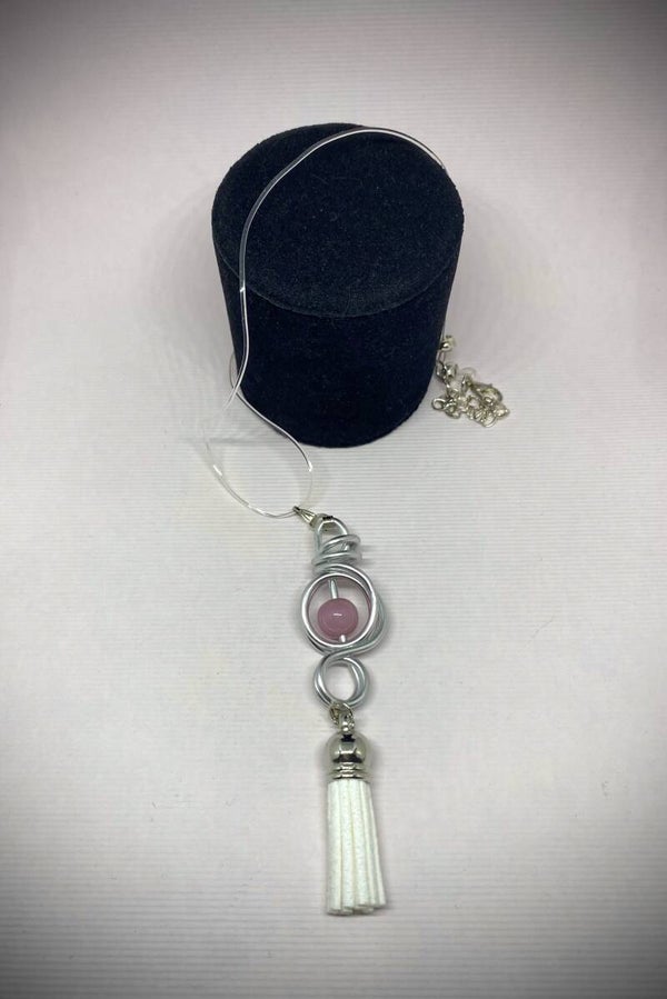 This transparent necklace features various materials, including an aluminum pendant with a pink bead and a suede tassel with a silver cap. It is a light-weight accessory, making it almost unnoticeable when worn. The necklace is perfect for summer days.