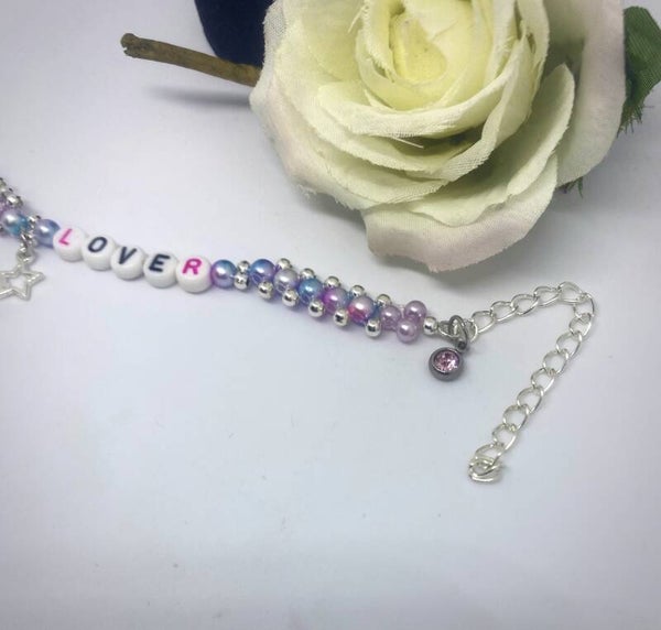 Deze betoverende handgemaakte armband is geïnspireerd op het album 'Lover' van Taylor Swift. Met zijn delicate ontwerp en verstelbare functie siert hij sierlijk je pols en zorgt hij voor een perfecte pasvorm. Of je hem nu alleen draagt of in combinatie met andere accessoires, deze armband is een perfecte herinnering om de liefde te omarmen en de schoonheid van het leven te vieren.