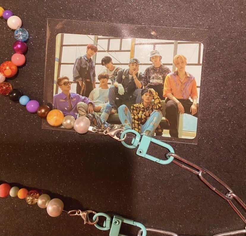 Ateez beaded necklace, with galvanized chain, lobster claws and a gold-tone lock + a Lomo card.